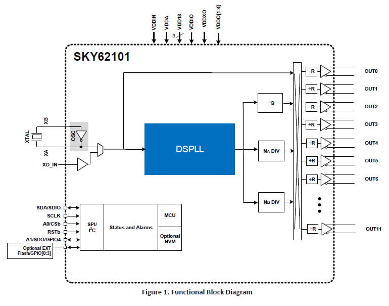 The SKY62101 clock generator combines Fifth-generation DSPLL® and MultiSynth™ technologies with an ultra-low jitter VCO to deliver ultra-low jitter (<55 fs) in PCIe Gen 1/2/3/4/5/6/7 compliant high-performance applications. The device is used in applications like 112G/224G SerDes, coherent optics, and data center equipment that demand the highest level of integration and jitter performance. All PLL components are integrated on-chip, eliminating the risk of noise coupling associated with discrete solutions. The SKY62101 supports free-run and synchronous operation by locking to an external crystal or oscillator. The SKY62101 is quickly and easily configured using Skyworks ClockBuilder® Pro (CBPro) software. ClockBuilder Pro assigns a custom part number for each unique configuration. Devices ordered with custom part numbers are factory-programmed, making it easy to get a custom clock configuration uniquely tailored for each application. Custom part numbers that are factory-programmed will power up with a known frequency configuration. The device may also be user-configured at power-up or internally configured in non-volatile memory (NVM) using the CBPro Field Programmer via the serial interface.