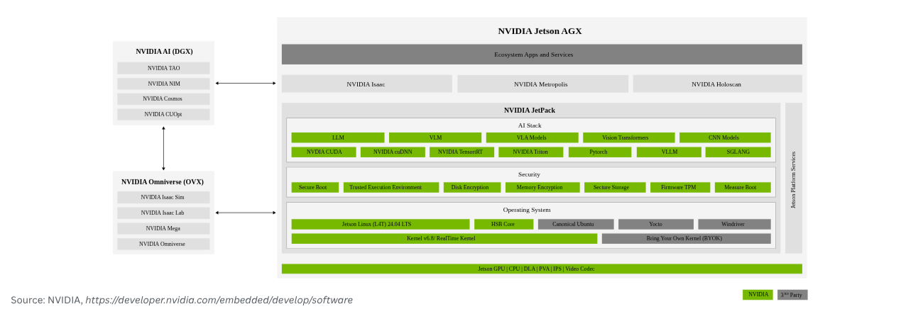 NVIDIA Jetson Thor 平台結合 NVIDIA 全面性的軟體生態,讓開發者能快速構建、部署並優化邊緣 AI 機器人應用。主要軟體與平台包括 :