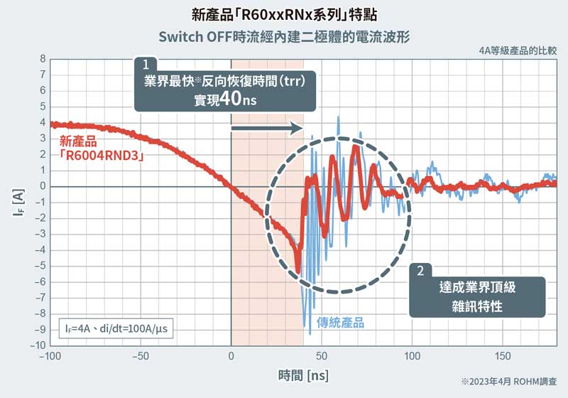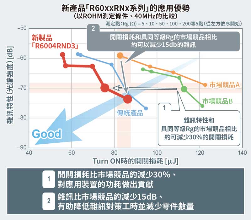 新產品不僅繼承了PrestoMOS™的特點—高速反向恢復時間(trr*2)特性,同時還進一步降低了雜訊。透過改善Lifetime控制*3技術,實現了40ns業界最快反向恢復時間,與市場競品相比,開關損耗降低約30%,有助進一步降低應用設備的功耗。另外,透過全新開發的獨家Super Junction結構,與市場競品相比,與反向恢復時間難以取捨的雜訊也降低了約15dB(ROHM測試條件、40MHz時的比較)。新產品實現了業界頂級特性,有助減少應用設備抗雜訊設計工時和零件數量。