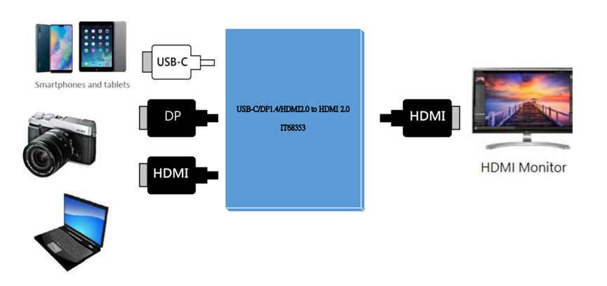 IT68353 為一款高度整合的單埠 USB Type-C/PD 控制器,內建雙埠 DisplayPort 與單埠 HDMI 2.0 接收端,可輸出至單一 HDMI 2.0 傳輸端。此晶片內建兩組 DisplayPort 接收端,其中一組可設定為支援 USB-C 輸入模式。支援 dead battery(無電源啟動)模式。在 USB PD 應用方面,IT68353 除了相容 PD 2.0 協議外,也支援 PD 3.0 所定義的 Chunk 模式,可滿足多樣化的電源管理需求。