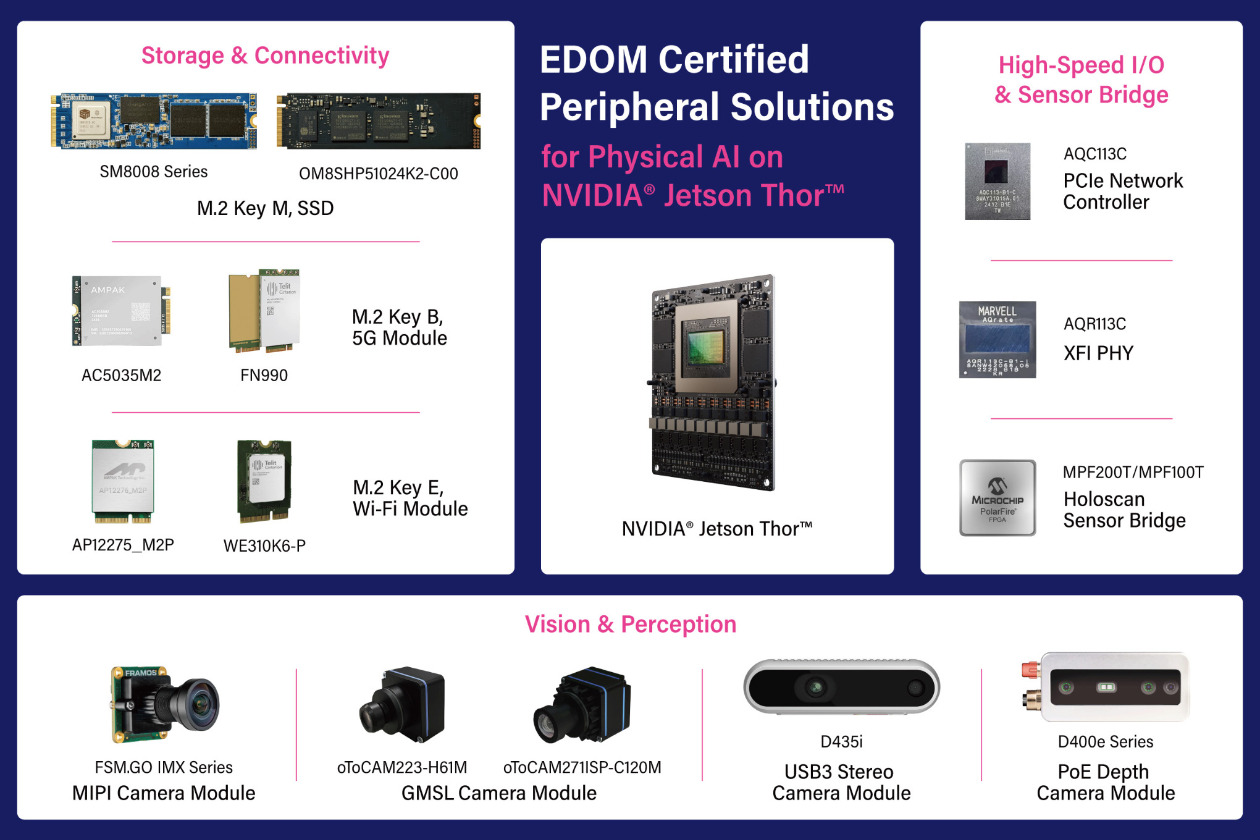 高效能相機與深度感測解決方案,為 Jetson Thor 提供即時視覺資料,以支援 AI 感知、場景理解與智慧決策。